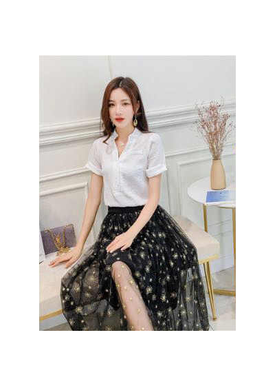 裙子跟T恤搭配是不少女孩子都非常青睐的选择,因为这种服装搭配能够***地体现女孩子的气质。这套白色体恤搭配黑色长裙,经典的搭配。T恤采用v领加立领的设计,更加时尚。纱网的裙子配上小雏菊印花,有一种更清新的视觉感。