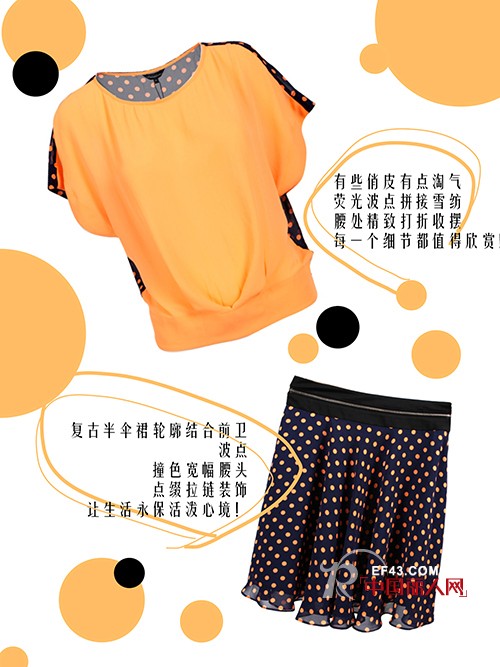荧光波点拼接雪纺,腰处精致打折收摆,复古伞裙撞色宽幅腰头,女人就该有些俏皮很有个性!
