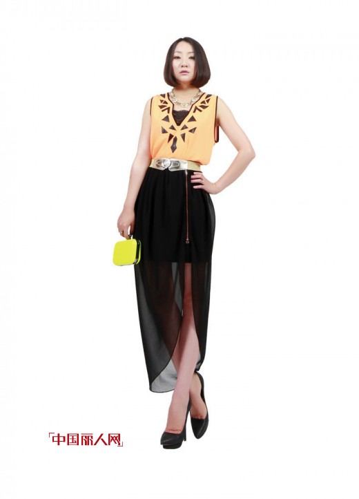 自由混搭两件套连衣裙,荧橘衬托白皙肤色,散摆裙型大气,胸前几何型透明片吸睛,妳的娆美身影这一次也完美如昔!
